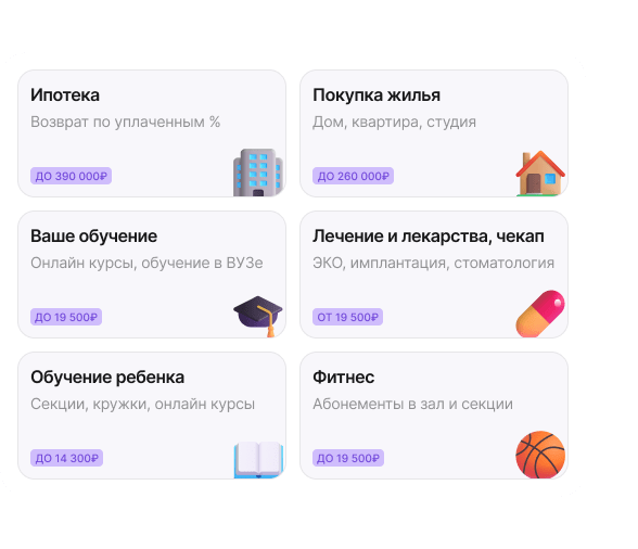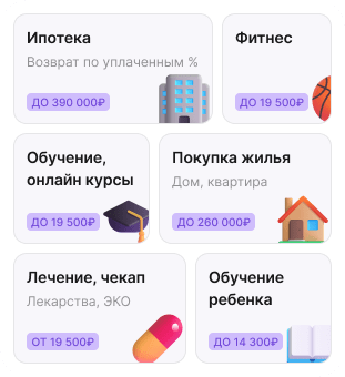 | Социальные вычеты | За расходы на обучение, фитнес, покупку рецептурных лекарств, лечение (например, платные анализы), благотворительность, страхование жизни и накопление пенсии. | Налогооблагаемая база уменьшается на 150 000 рублей в год максимум. Максимальная сумма вычета — 19 500 рублей в год по всем расходам, включённым в группу до 2024г. | Также к социальным вычетам относятся расходы на дорогостоящее лечение. Но для них нет ограничений по сумме. |
